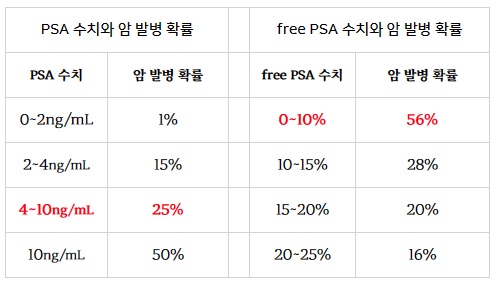 4) Free PSA ratio 혈액 검사: PAS 수치의 검사상 암이 의심되는 상황이라면 진단의 정확도를 높이기 위해 시행합니다. PSA 중 free PSA가 차지하고 있는 비율을 검사하는 것으로써 그 비율이 10% 이하이면 암일 가능성이 증가하고 25% 이상이면 암일 가능성이 작다고 합니다.